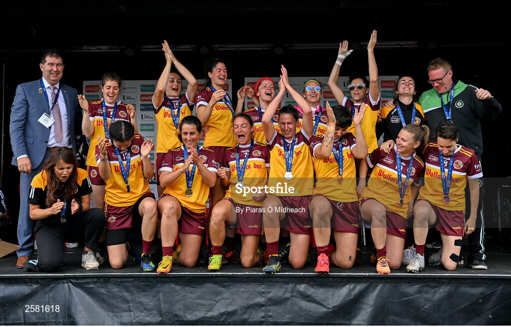 27 July 2023; Siróc celebrate with their runner's up medals from the Ladies Football International Plate Final during day four of the FRS Recruitment GAA World Games 2023 at the Owenbeg Centre of Excellence in Dungiven, Derry. Photo by Piaras Ó Mídheach/Sportsfile