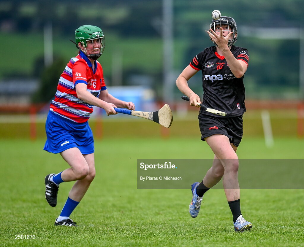 27 July 2023; Alanna Budden of Canada in action against Katrina Terry of USA Warriors during day four of the FRS Recruitment GAA World Games 2023 at the Owenbeg Centre of Excellence in Dungiven, Derry. Photo by Piaras Ó Mídheach/Sportsfile