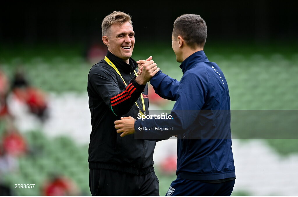 6 August 2023; Manchester United Technical Director Darren Fletcher, left, with former Manchester United and current Athletic Bilbao player Ander Herrera before the pre-season friendly match between Manchester United and Athletic Bilbao at the Aviva Stadium in Dublin. Photo by David Fitzgerald/Sportsfile