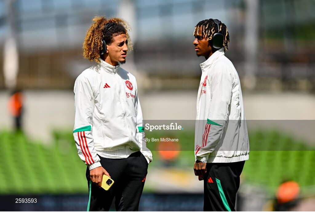 6 August 2023; Hannibal Mejbri, left, and Noam Emeran of Manchester United before the pre-season friendly match between Manchester United and Athletic Bilbao at the Aviva Stadium in Dublin. Photo by Ben McShane/Sportsfile