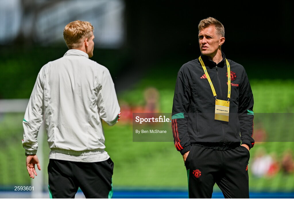 6 August 2023; Manchester United technical director Darren Fletcher, right, and Donny van der Beek of Manchester United before the pre-season friendly match between Manchester United and Athletic Bilbao at the Aviva Stadium in Dublin. Photo by Ben McShane/Sportsfile