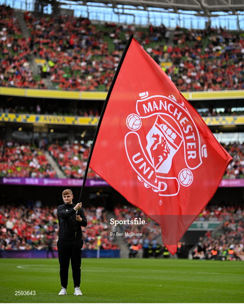 6 August 2023; A flagbearer is seen before the pre-season friendly match between Manchester United and Athletic Bilbao at the Aviva Stadium in Dublin. Photo by Ben McShane/Sportsfile