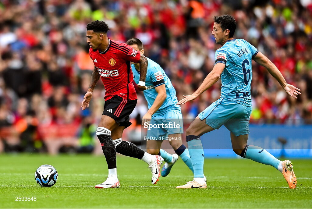 6 August 2023; Jadon Sancho of Manchester United in action against Mikel Vesga of Athletic Bilbao during the pre-season friendly match between Manchester United and Athletic Bilbao at the Aviva Stadium in Dublin. Photo by David Fitzgerald/Sportsfile
