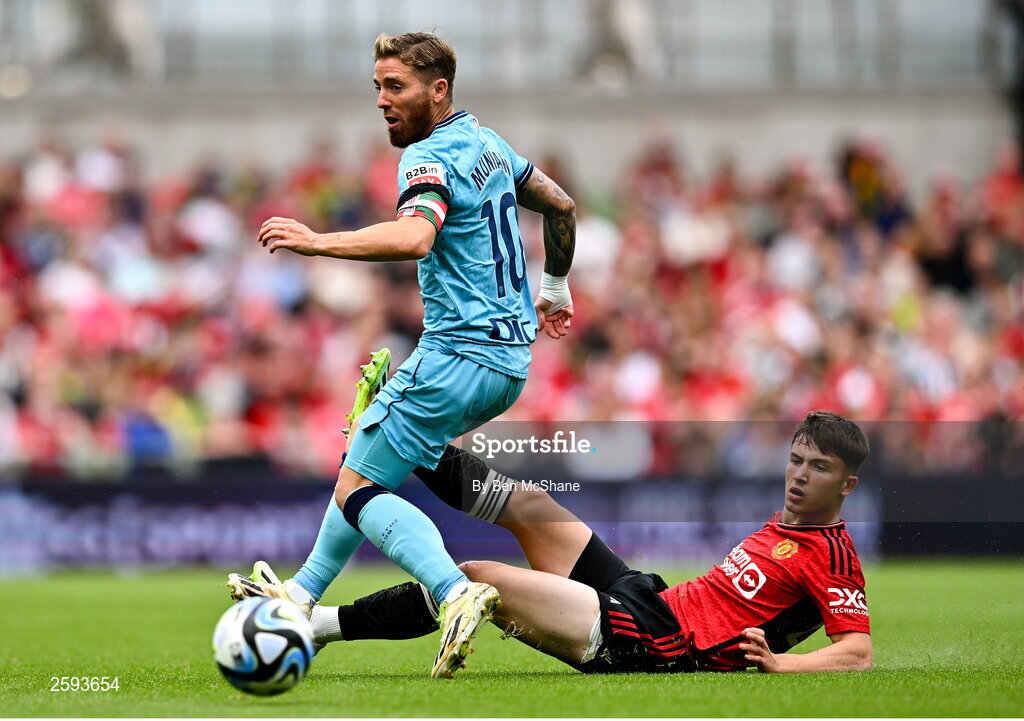 6 August 2023; Iker Muniain of Athletic Bilbao is tackled by Dan Gore of Manchester United during the pre-season friendly match between Manchester United and Athletic Bilbao at the Aviva Stadium in Dublin. Photo by Ben McShane/Sportsfile