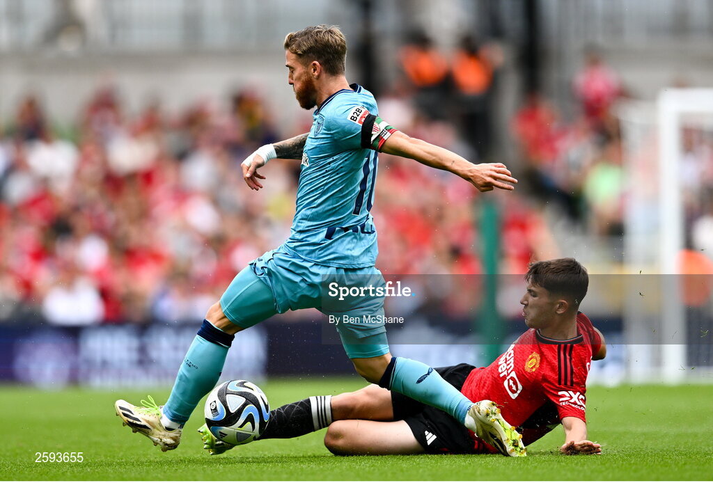 6 August 2023; Iker Muniain of Athletic Bilbao is tackled by Dan Gore of Manchester United during the pre-season friendly match between Manchester United and Athletic Bilbao at the Aviva Stadium in Dublin. Photo by Ben McShane/Sportsfile