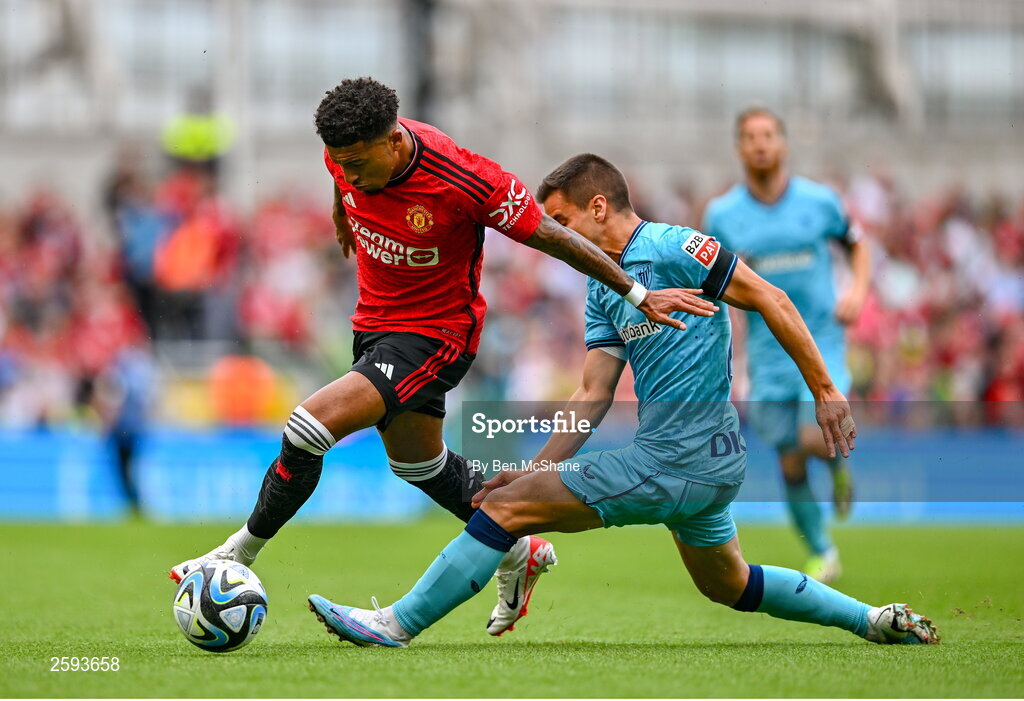 6 August 2023; Jadon Sancho of Manchester United in action against Iñigo Ruiz de Galarreta of Athletic Bilbao during the pre-season friendly match between Manchester United and Athletic Bilbao at the Aviva Stadium in Dublin. Photo by Ben McShane/Sportsfile