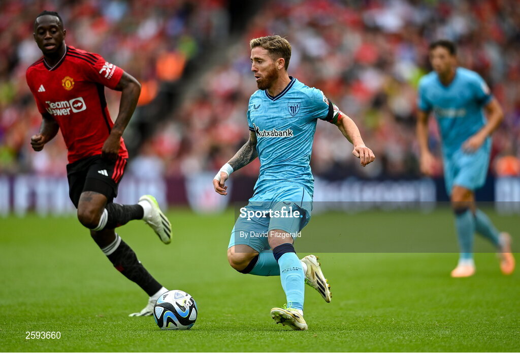 6 August 2023; Iker Muniain of Athletic Bilbao in action against Aaron Wan-Bissaka of Manchester United during the pre-season friendly match between Manchester United and Athletic Bilbao at the Aviva Stadium in Dublin. Photo by David Fitzgerald/Sportsfile