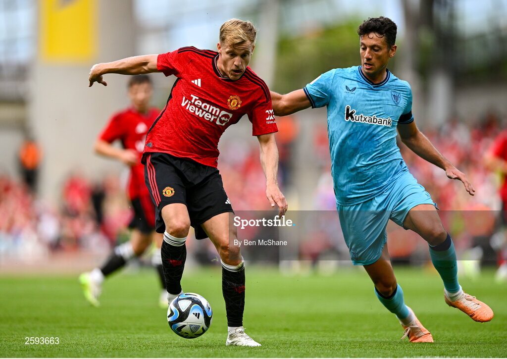 6 August 2023; Donny van de Beek of Manchester United in action against Mikel Vesga of Athletic Bilbao during the pre-season friendly match between Manchester United and Athletic Bilbao at the Aviva Stadium in Dublin. Photo by Ben McShane/Sportsfile