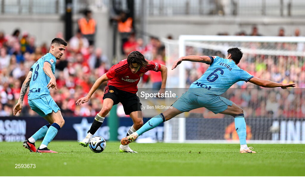 6 August 2023; Álvaro Fernández of Manchester United in action against Oihan Sancet, left, and Mikel Vesga of Athletic Bilbao during the pre-season friendly match between Manchester United and Athletic Bilbao at the Aviva Stadium in Dublin. Photo by Ben McShane/Sportsfile