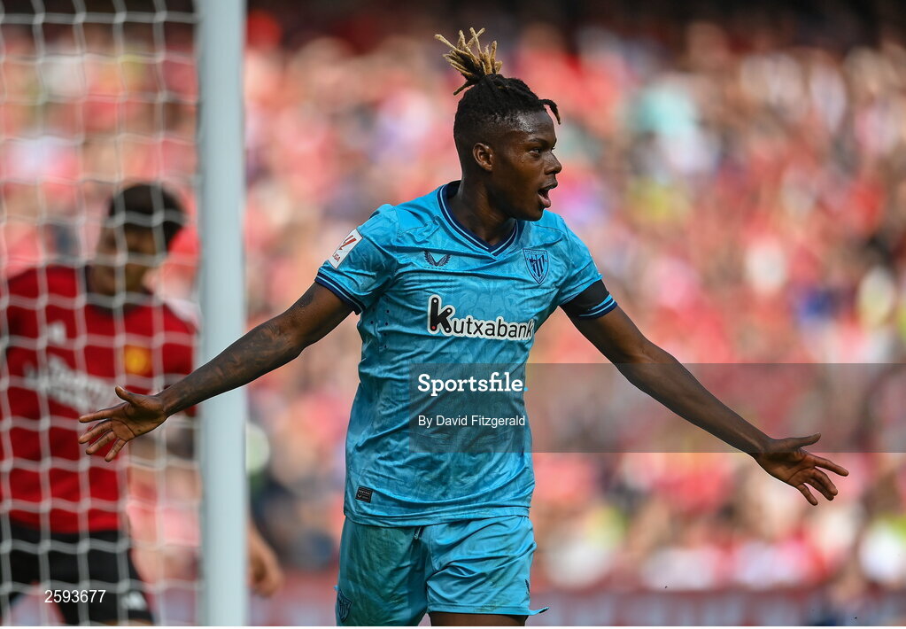 6 August 2023; Nico Williams of Athletic Bilbao celebrates after scoring his side's first goal during the pre-season friendly match between Manchester United and Athletic Bilbao at the Aviva Stadium in Dublin. Photo by David Fitzgerald/Sportsfile