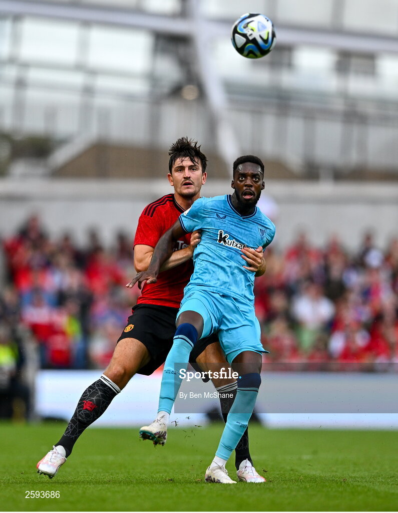 6 August 2023; Inaki Williams of Athletic Bilbao in action against Harry Maguire of Manchester United during the pre-season friendly match between Manchester United and Athletic Bilbao at the Aviva Stadium in Dublin. Photo by Ben McShane/Sportsfile