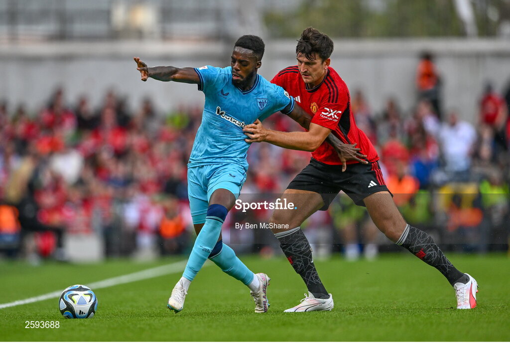 6 August 2023; Inaki Williams of Athletic Bilbao in action against Harry Maguire of Manchester United during the pre-season friendly match between Manchester United and Athletic Bilbao at the Aviva Stadium in Dublin. Photo by Ben McShane/Sportsfile