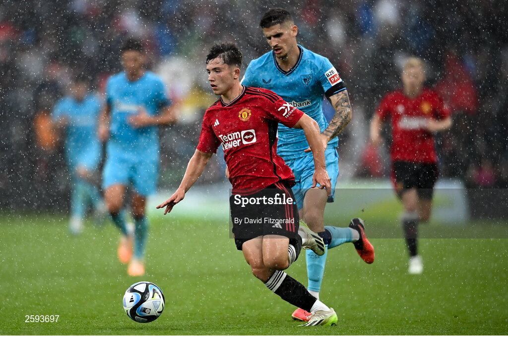 6 August 2023; Dan Gore of Manchester United in action against Oscar De Marcos of Athletic Bilbao during the pre-season friendly match between Manchester United and Athletic Bilbao at the Aviva Stadium in Dublin. Photo by David Fitzgerald/Sportsfile