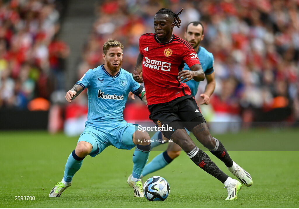 6 August 2023; Aaron Wan-Bissaka of Manchester United in action against Iker Muniain of Athletic Bilbao during the pre-season friendly match between Manchester United and Athletic Bilbao at the Aviva Stadium in Dublin. Photo by David Fitzgerald/Sportsfile