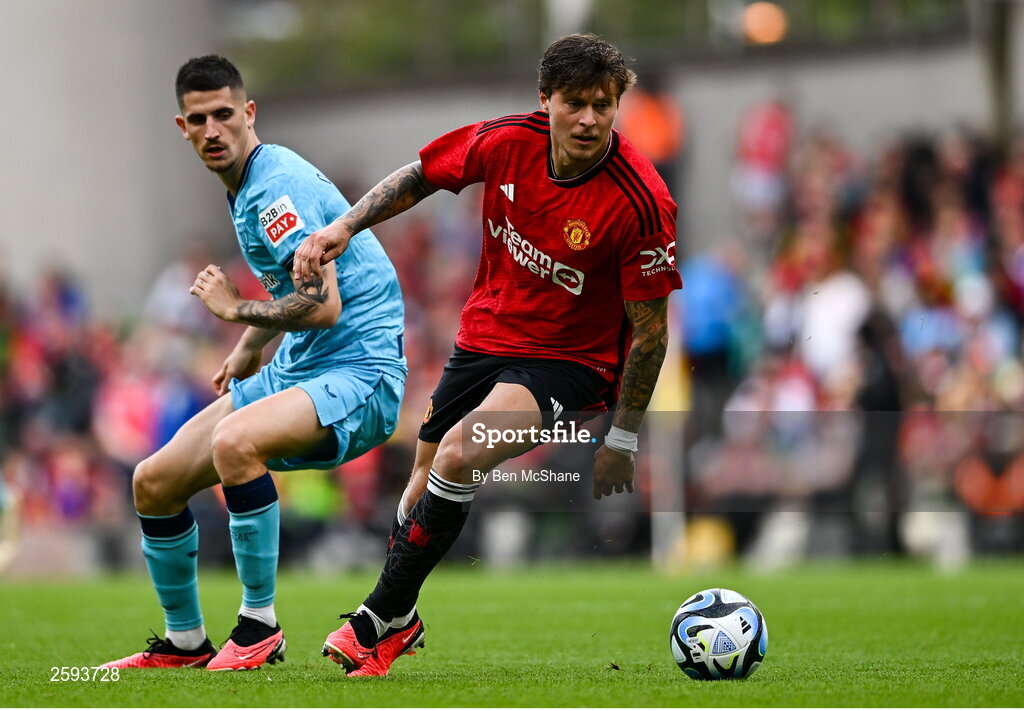 6 August 2023; Victor Lindelöf of Manchester United in action against Oihan Sancet of Athletic Bilbao during the pre-season friendly match between Manchester United and Athletic Bilbao at the Aviva Stadium in Dublin. Photo by Ben McShane/Sportsfile