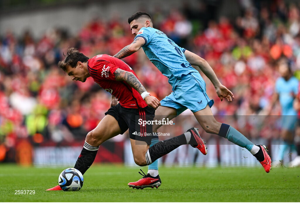 6 August 2023; Victor Lindelöf of Manchester United in action against Oihan Sancet of Athletic Bilbao during the pre-season friendly match between Manchester United and Athletic Bilbao at the Aviva Stadium in Dublin. Photo by Ben McShane/Sportsfile