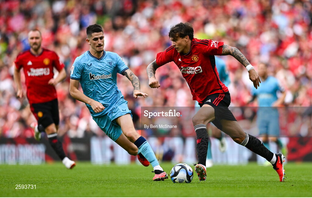 6 August 2023; Victor Lindelöf of Manchester United in action against Oihan Sancet of Athletic Bilbao during the pre-season friendly match between Manchester United and Athletic Bilbao at the Aviva Stadium in Dublin. Photo by Ben McShane/Sportsfile