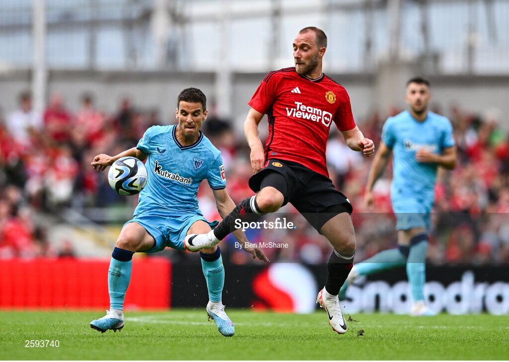6 August 2023; Christian Eriksen of Manchester United in action against Iñigo Ruiz de Galarreta of Athletic Bilbao during the pre-season friendly match between Manchester United and Athletic Bilbao at the Aviva Stadium in Dublin. Photo by Ben McShane/Sportsfile