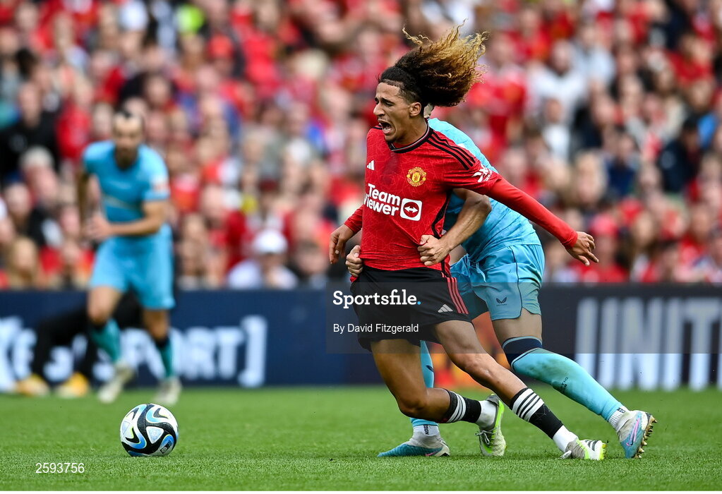 6 August 2023; Hannibal of Manchester United is tackled by Aitor Paredes of Athletic Bilbao resulting in a red card during the pre-season friendly match between Manchester United and Athletic Bilbao at the Aviva Stadium in Dublin. Photo by David Fitzgerald/Sportsfile