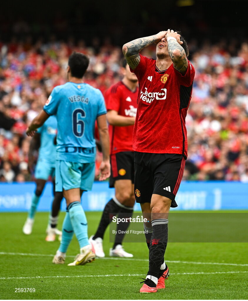 6 August 2023; Victor Lindelöf of Manchester United reacts during the pre-season friendly match between Manchester United and Athletic Bilbao at the Aviva Stadium in Dublin. Photo by David Fitzgerald/Sportsfile