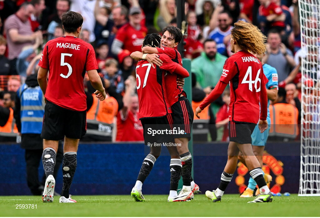 6 August 2023; Facundo Pellistri of Manchester United celebrates with teammate Noam Emeran after scoring their first goal during the pre-season friendly match between Manchester United and Athletic Bilbao at the Aviva Stadium in Dublin. Photo by Ben McShane/Sportsfile
