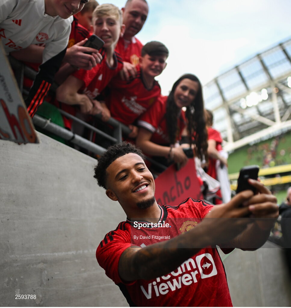 6 August 2023; Jadon Sancho of Manchester United takes a photo with supporters after the pre-season friendly match between Manchester United and Athletic Bilbao at the Aviva Stadium in Dublin. Photo by David Fitzgerald/Sportsfile