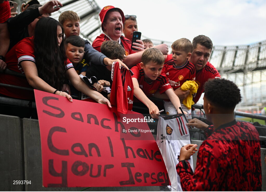 6 August 2023; Jadon Sancho of Manchester with supporters after the pre-season friendly match between Manchester United and Athletic Bilbao at the Aviva Stadium in Dublin. Photo by David Fitzgerald/Sportsfile