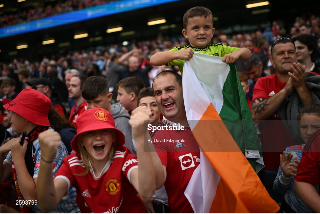 6 August 2023; Manchester United supporters celebrate their side's first goal during the pre-season friendly match between Manchester United and Athletic Bilbao at the Aviva Stadium in Dublin. Photo by David Fitzgerald/Sportsfile