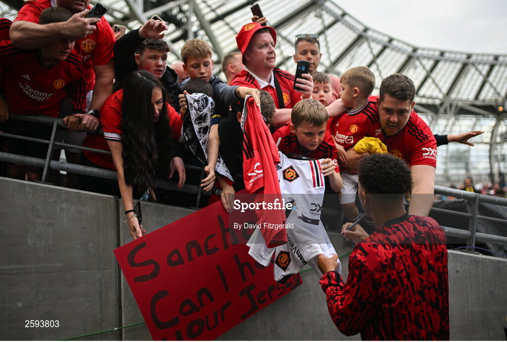 6 August 2023; Jadon Sancho of Manchester with supporters after the pre-season friendly match between Manchester United and Athletic Bilbao at the Aviva Stadium in Dublin. Photo by David Fitzgerald/Sportsfile