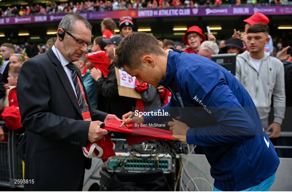 6 August 2023; Ander Herrera of Athletic Bilbao signs autographs for supporters after the pre-season friendly match between Manchester United and Athletic Bilbao at the Aviva Stadium in Dublin. Photo by Ben McShane/Sportsfile