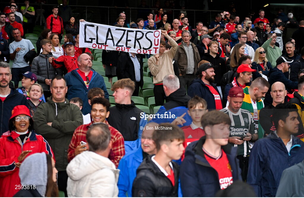 6 August 2023; Manchester United supporters hold up a sign after the pre-season friendly match between Manchester United and Athletic Bilbao at the Aviva Stadium in Dublin. Photo by Ben McShane/Sportsfile