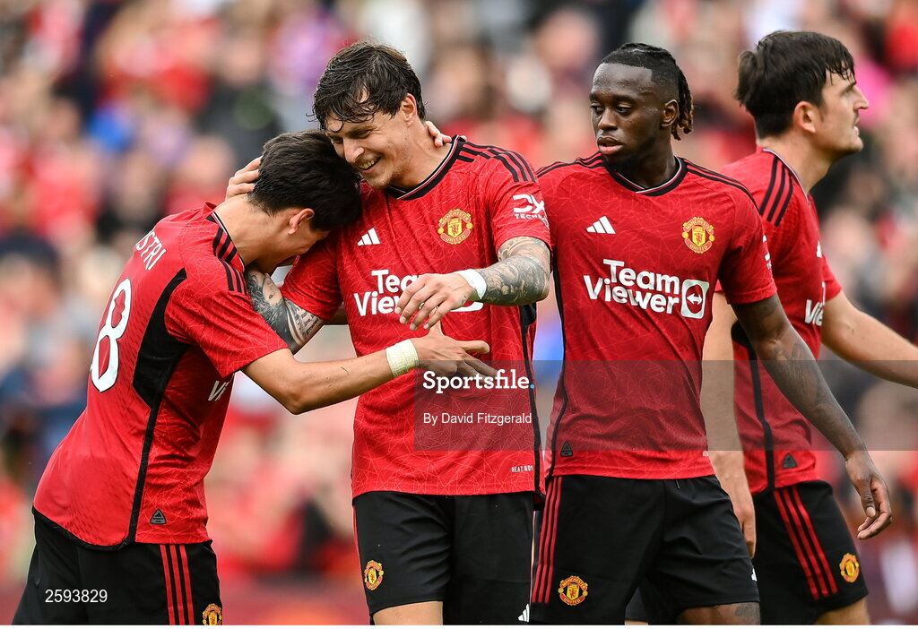 6 August 2023; Facundo Pellistri of Manchester United, left, is congratulated by teammate Victor Lindelöf after scoring their side's first goal during the pre-season friendly match between Manchester United and Athletic Bilbao at the Aviva Stadium in Dublin. Photo by David Fitzgerald/Sportsfile