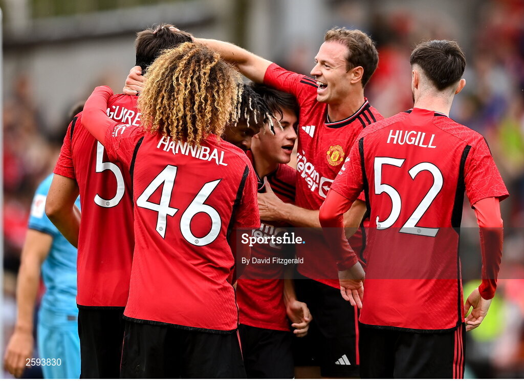 6 August 2023; Facundo Pellistri of Manchester United, centre, is congratulated by teammates after scoring their side's first goal during the pre-season friendly match between Manchester United and Athletic Bilbao at the Aviva Stadium in Dublin. Photo by David Fitzgerald/Sportsfile