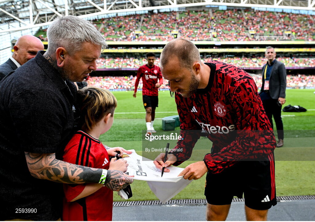 6 August 2023; Manchester United mascot Finn O'Shea, age 9, from Clonmel, Tipperary with Christian Eriksen of Manchester United before the pre-season friendly match between Manchester United and Athletic Bilbao at the Aviva Stadium in Dublin. Photo by David Fitzgerald/Sportsfile