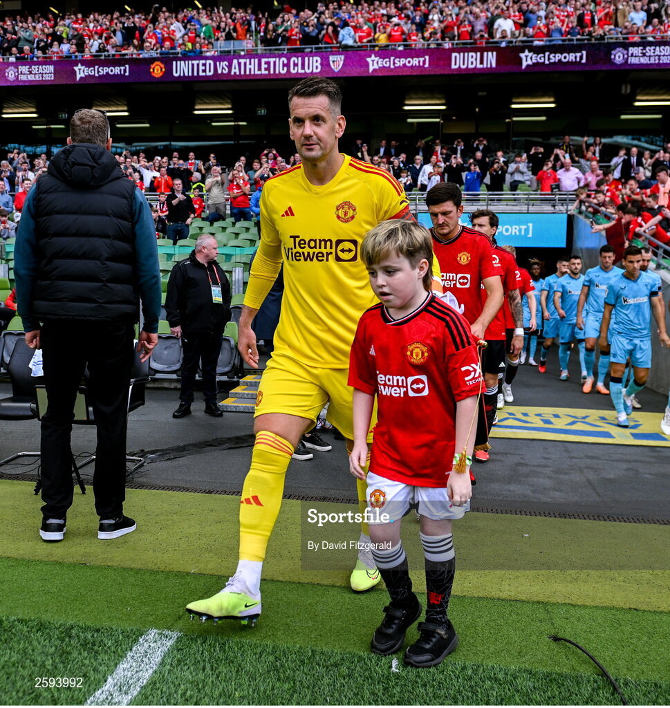 6 August 2023; Manchester United mascot Finn O'Shea, age 9, from Clonmel, Tipperary walks out with Tom Heaton of Manchester United before the pre-season friendly match between Manchester United and Athletic Bilbao at the Aviva Stadium in Dublin. Photo by David Fitzgerald/Sportsfile