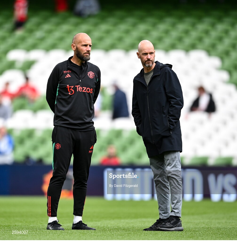 6 August 2023; Manchester United manager Erik ten Hag, right, and assistant manager Mitchell van der Gaag before the pre-season friendly match between Manchester United and Athletic Bilbao at the Aviva Stadium in Dublin. Photo by David Fitzgerald/Sportsfile