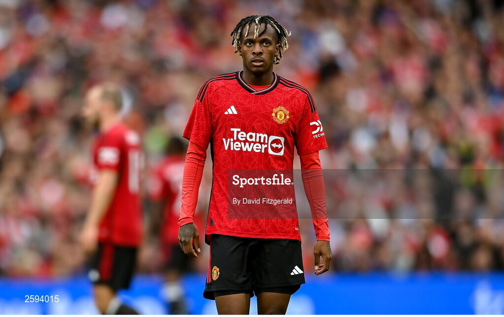 6 August 2023; Noam Emeran of Manchester United during the pre-season friendly match between Manchester United and Athletic Bilbao at the Aviva Stadium in Dublin. Photo by David Fitzgerald/Sportsfile