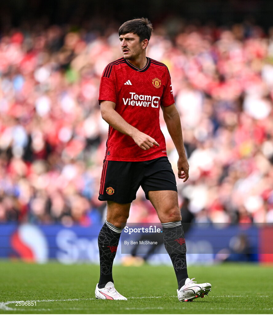 6 August 2023; Harry Maguire of Manchester United during the pre-season friendly match between Manchester United and Athletic Bilbao at the Aviva Stadium in Dublin. Photo by Ben McShane/Sportsfile
