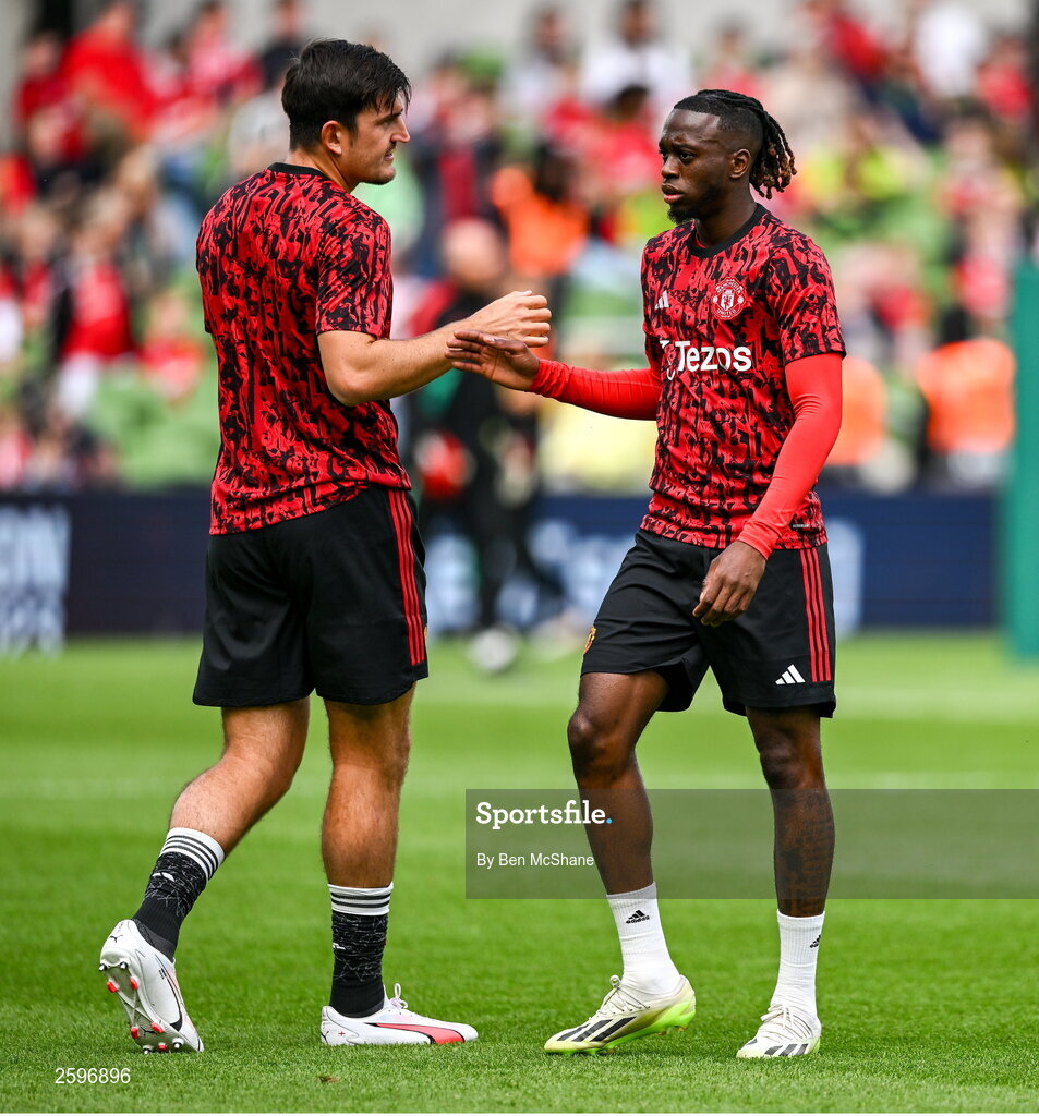 6 August 2023; Harry Maguire, left, and Aaron Wan-Bissaka of Manchester United before the pre-season friendly match between Manchester United and Athletic Bilbao at the Aviva Stadium in Dublin. Photo by Ben McShane/Sportsfile