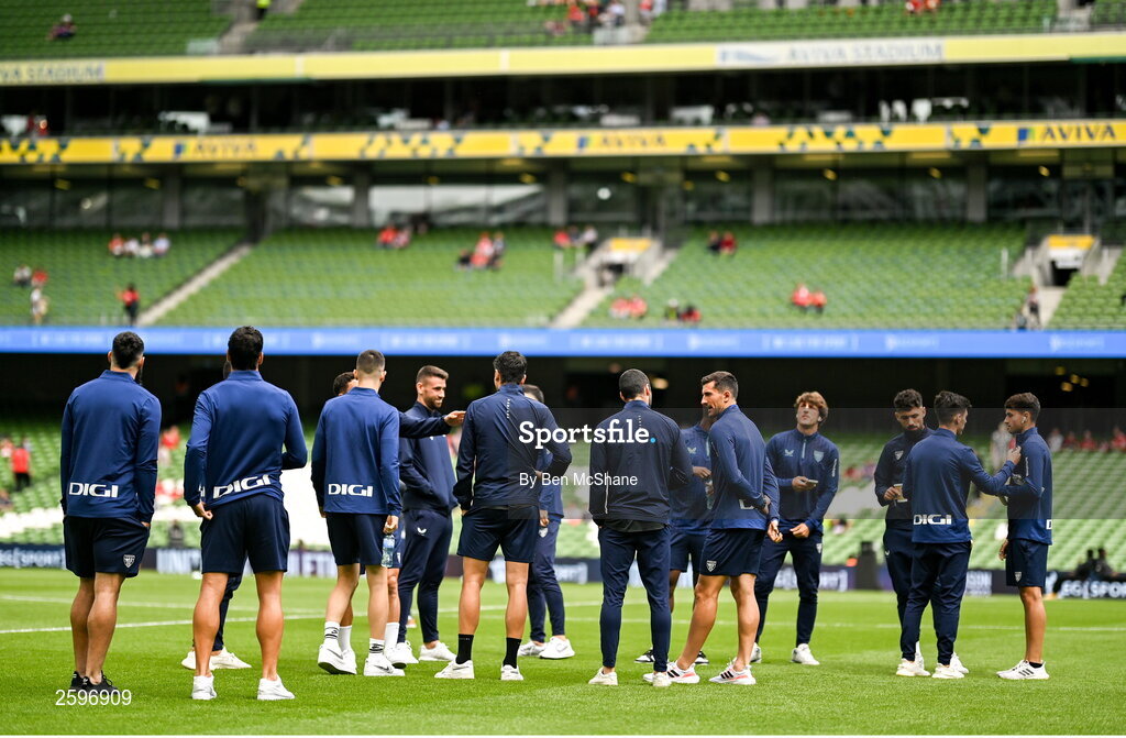 6 August 2023; Athletic Bilbao players inspect the pitch before the pre-season friendly match between Manchester United and Athletic Bilbao at the Aviva Stadium in Dublin. Photo by Ben McShane/Sportsfile