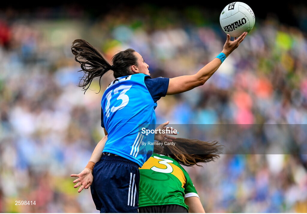 13 August 2023; Hannah Tyrrell of Dublin in action against Kayleigh Cronin of Kerry during the 2023 TG4 LGFA All-Ireland Senior Championship Final match between Dublin and Kerry at Croke Park in Dublin. Photo by Ramsey Cardy/Sportsfile