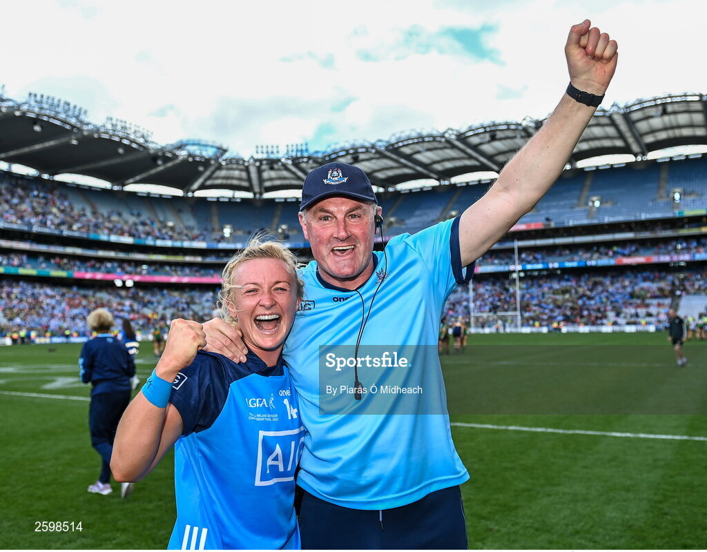 13 August 2023; Dublin manager Mick Bohan celebrates with team captain Carla Rowe after their side's victory in the 2023 TG4 LGFA All-Ireland Senior Championship Final match between Dublin and Kerry at Croke Park in Dublin. Photo by Piaras Ó Mídheach/Sportsfile