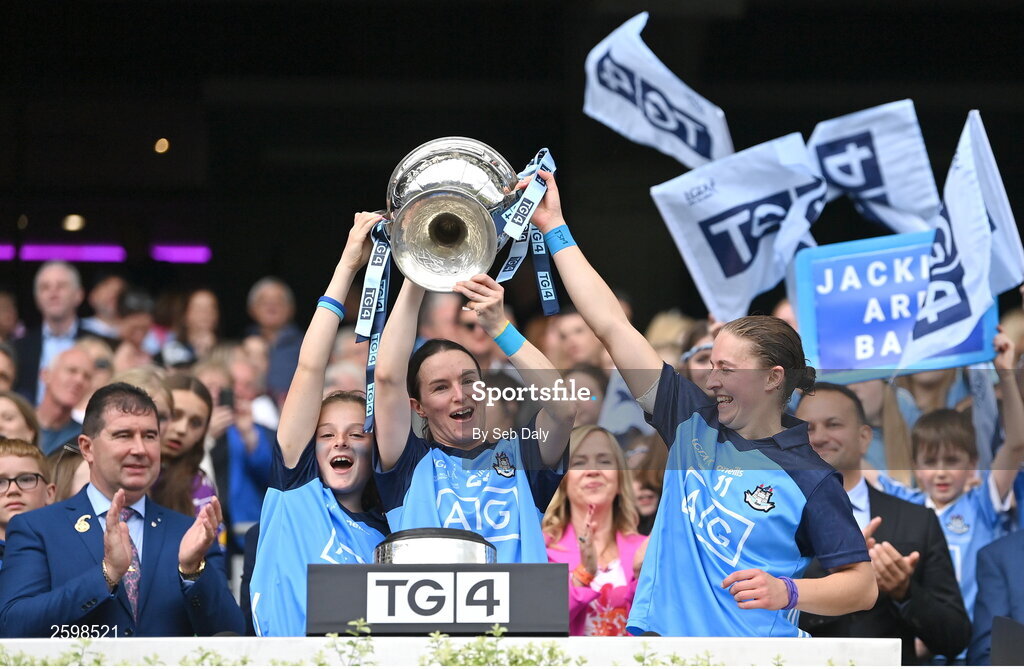 13 August 2023; Dublin players Sinéad Aherne, centre, and Orlagh Nolan, right, lift the Brendan Martin Cup after the 2023 TG4 LGFA All-Ireland Senior Championship Final match between Dublin and Kerry at Croke Park in Dublin. Photo by Seb Daly/Sportsfile