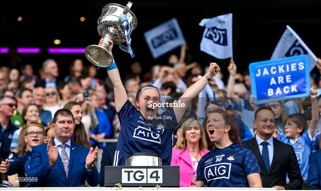 13 August 2023; Dublin goalkeeper Abby Shiels lifts the Brendan Martin Cup after the 2023 TG4 LGFA All-Ireland Senior Championship Final match between Dublin and Kerry at Croke Park in Dublin. Photo by Seb Daly/Sportsfile
