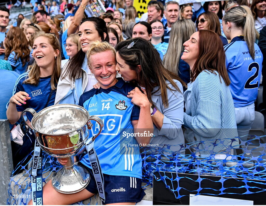 13 August 2023; Dublin captain Carla Rowe celebrates with her former team-mate Lyndsey Davey after the 2023 TG4 LGFA All-Ireland Senior Championship Final match between Dublin and Kerry at Croke Park in Dublin. Photo by Piaras Ó Mídheach/Sportsfile