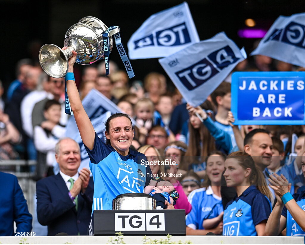 13 August 2023; Player of the match Hannah Tyrrell of Dublin lifts the Brendan Martin Cup as she celebrates with her daugher Aoife, age 7 weeks, after victory in the 2023 TG4 LGFA All-Ireland Senior Championship Final match between Dublin and Kerry at Croke Park in Dublin. Photo by Piaras Ó Mídheach/Sportsfile