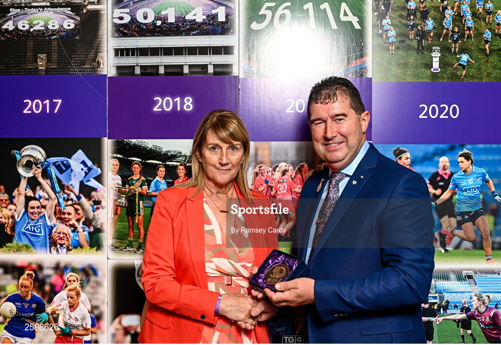 13 August 2023; 1979 Offaly All-Ireland winning captain Doreen Daly is presented with a medallion by Uachtarán Cumann Peil Gael na mBan Mícheál Naughton during a special luncheon before the TG4 LGFA All-Ireland Senior Championship Final at Croke Park in Dublin. Photo by Ramsey Cardy/Sportsfile