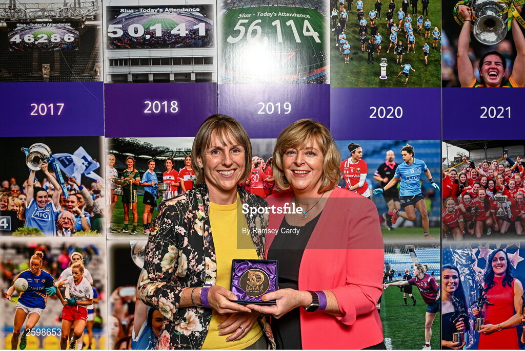 13 August 2023; 2000 Mayo All-Ireland winning captain Maria Staunton is presented with a medallion by former LGFA President Marie Hickey during a special luncheon before the TG4 LGFA All-Ireland Senior Championship Final at Croke Park in Dublin. Photo by Ramsey Cardy/Sportsfile