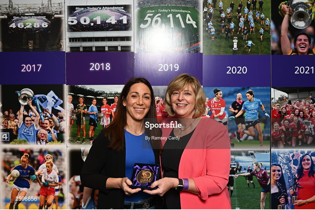 13 August 2023; 2010 Dublin All-Ireland winning captain Denise Masterson is presented with a medallion by former LGFA President Marie Hickey during a special luncheon before the TG4 LGFA All-Ireland Senior Championship Final at Croke Park in Dublin. Photo by Ramsey Cardy/Sportsfile