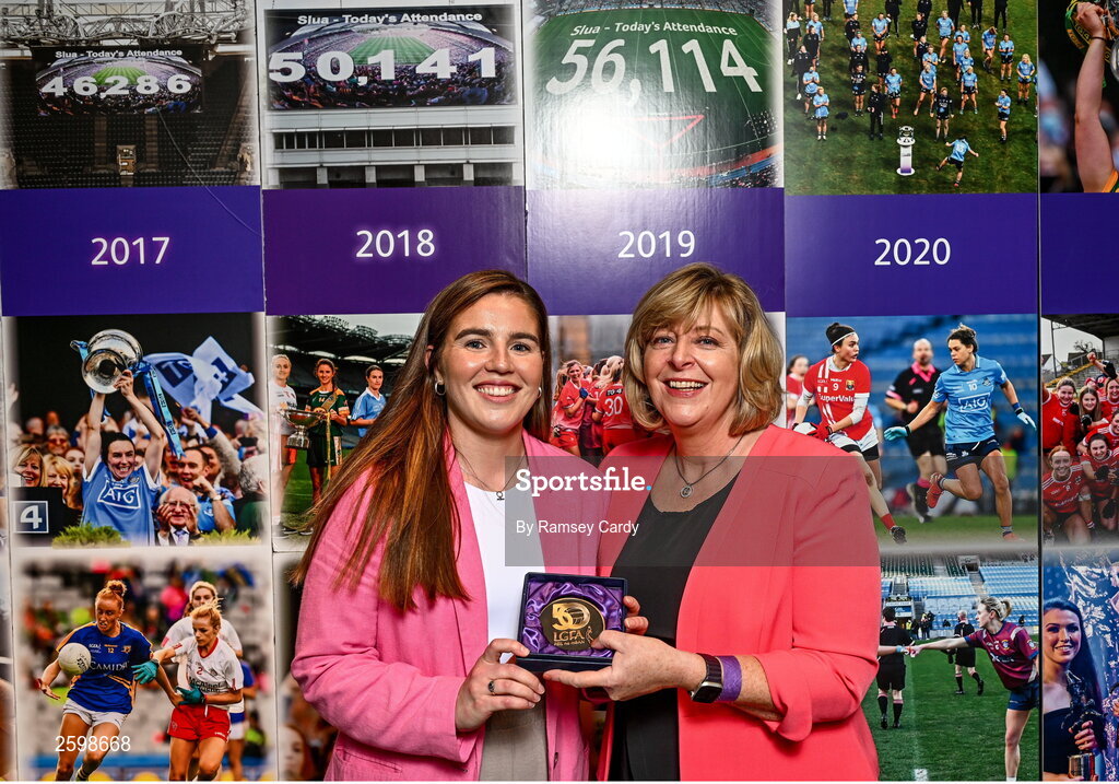 13 August 2023; 2021 and 2022 Meath All-Ireland winning captain Shauna Ennis is presented with a medallion by former LGFA President Marie Hickey during a special luncheon before the TG4 LGFA All-Ireland Senior Championship Final at Croke Park in Dublin. Photo by Ramsey Cardy/Sportsfile